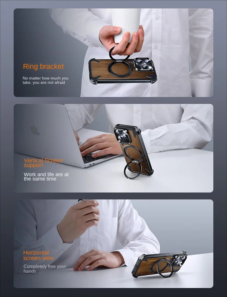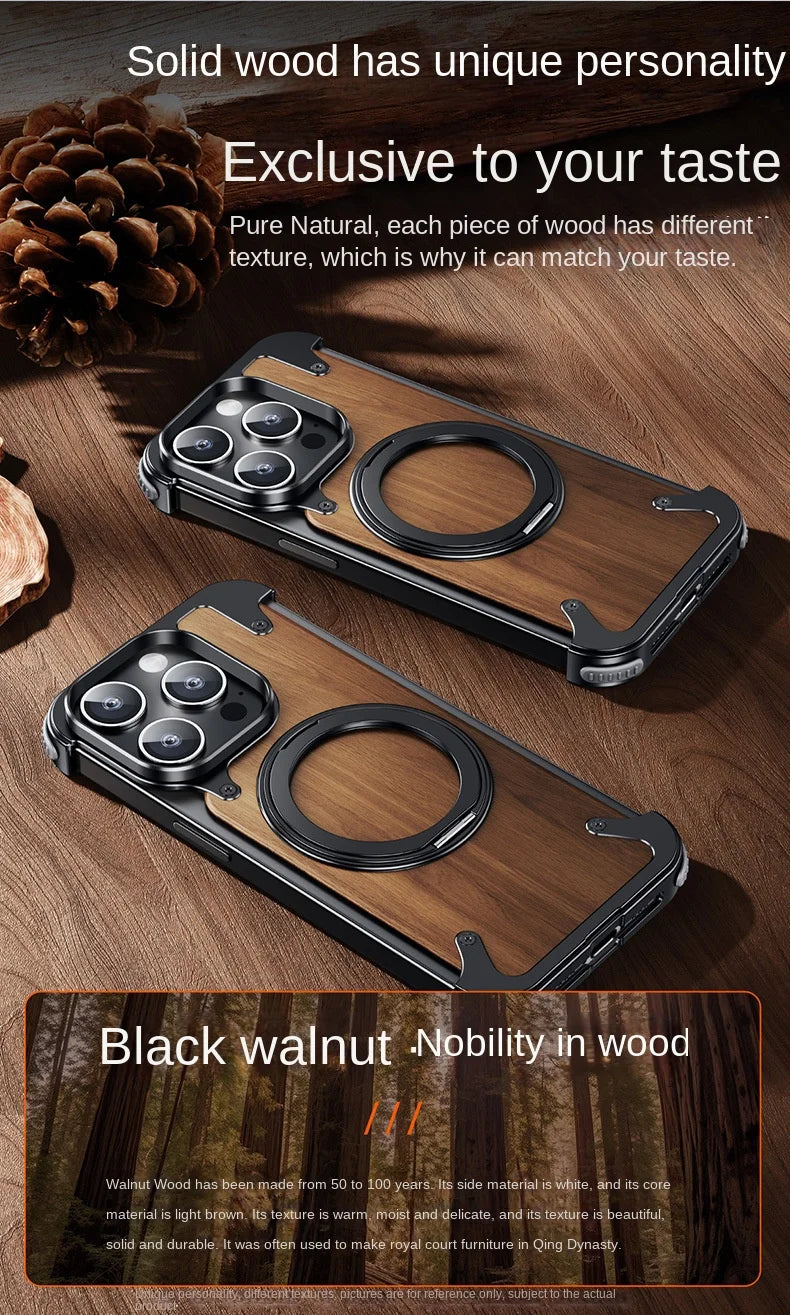 Luxury Magnetic Magsafe Phone Case for IPhone 15 14 13 Pro Max Walnut Wood Metal Case 360°Rotating Ring Stand Framework